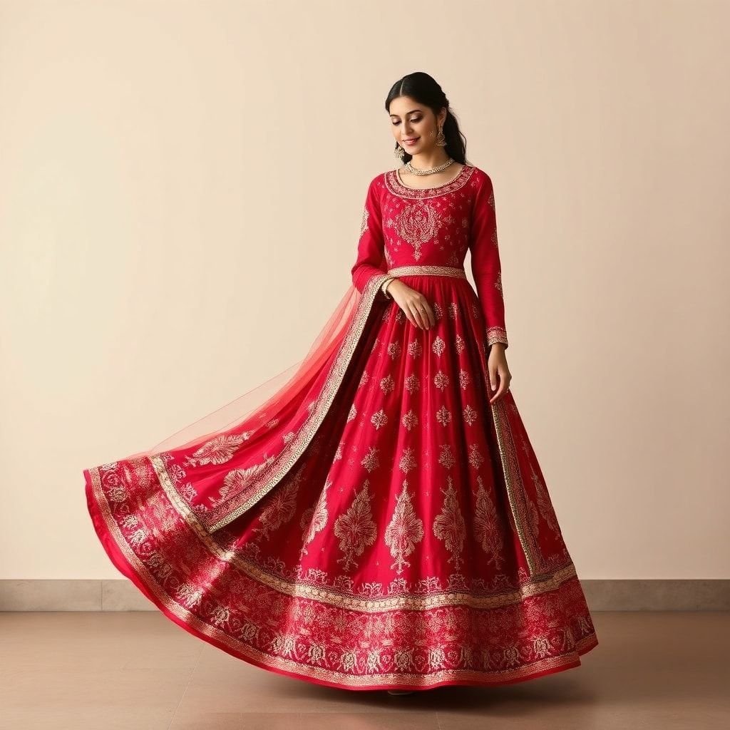Embrace timeless tradition and exquisite craftsmanship with this magnificent classic red Anarkali salwar kameez. Designed for the discerning woman who appreciates heritage and style, this ensemble is a true masterpiece. The base of the Anarkali is fashioned from a rich, opulent brocade fabric, renowned for its intricate woven patterns and luxurious sheen. This fabric lends a substantial yet graceful drape to the garment, ensuring it moves beautifully with every step. The vibrant, classic red hue is universally flattering and evokes a sense of festivity and celebration, making it an ideal choice for weddings, festivals, and grand gatherings.